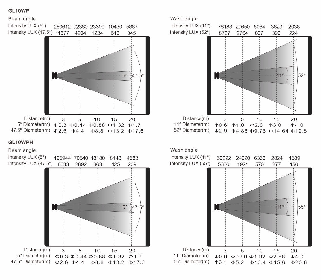 变焦范围:光束模式:5°- 47.5°(GL10WP/GL10WPH),染色模式:11°-52°(GL10WP),11°-55°(GL10WPH)