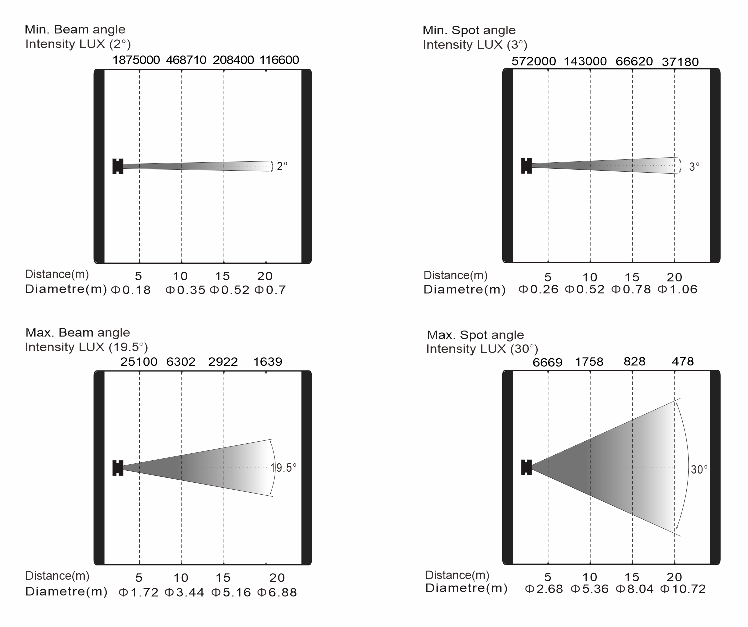 变焦范围:光束模式:2°-19.5°,图案模式:3°-30°