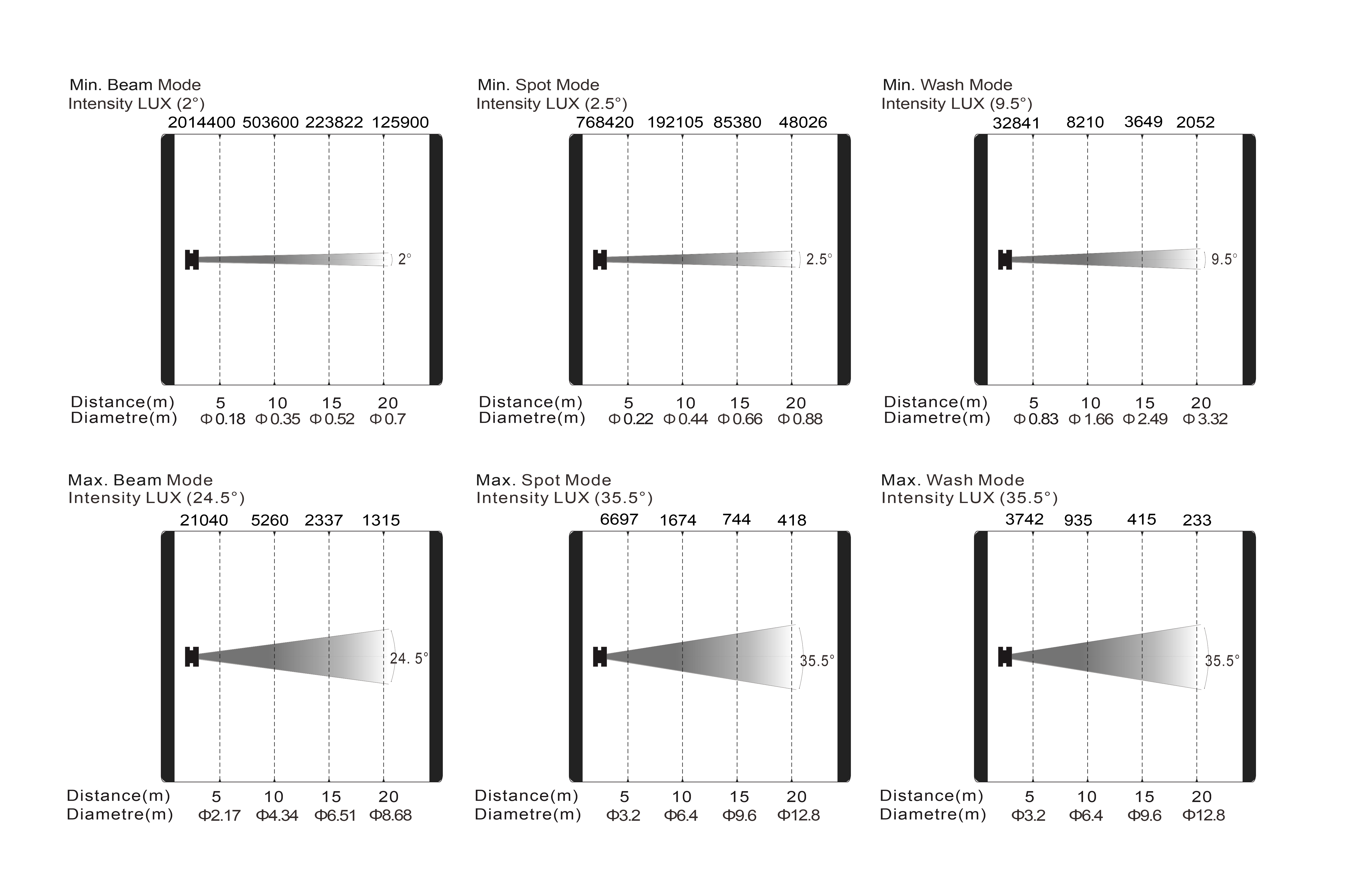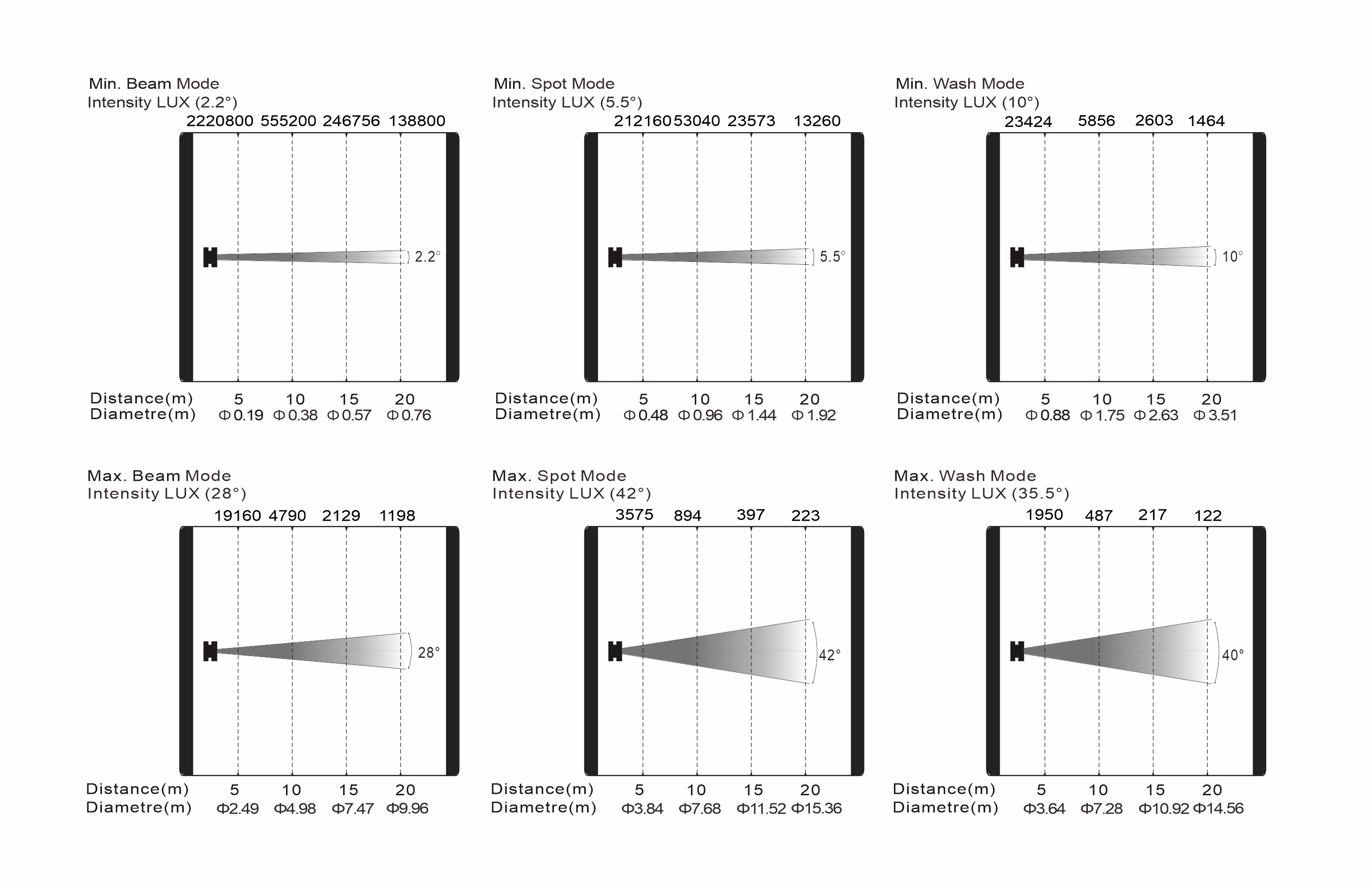 放大:光束模式:2.2°- 28°;图案模式:5.5°-42°;染色模式:10°-40°