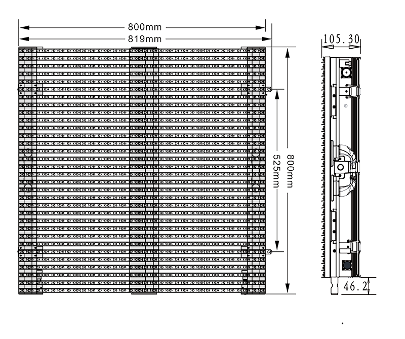 “条屏”系列LED显示屏利用框架结构,把顶部拉条、底部拉条、中心电源盒及LED灯条紧密的连结在一起。这样的结构设计可以实现快速、方便的前后双面安装及维护。